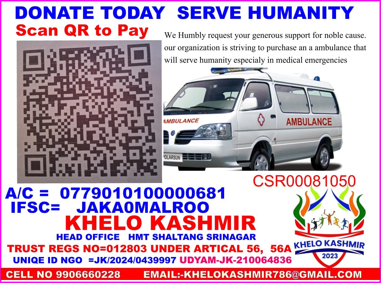 Khelo Kashmir is working towards arranging an ambulance to provide fast and reliable emergency medical support to the people of Kashmir. In many critical situations, the lack of timely transportation costs precious lives.